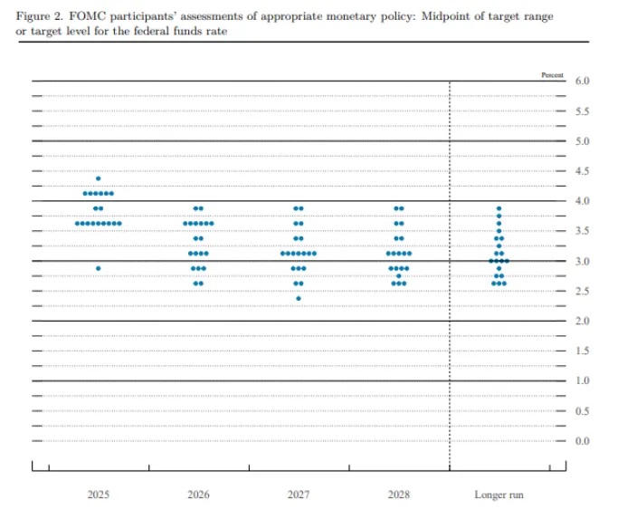 “点阵图”显示,美联储官员的中位预期是今年底之前再降息0.5个百分点。这意味着决策层倾向于在今年余下的两次议息会议上各再降息25个基点,使年底利率区间降至大约3.5%~3.75%的水平。