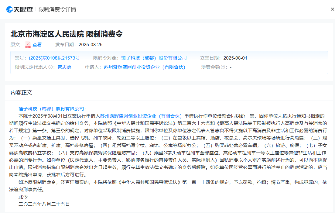 此前,锤子科技(成都)股份有限公司已因上述案件被执行2142万余元,公司法定代表人管志良也被限制高消费。