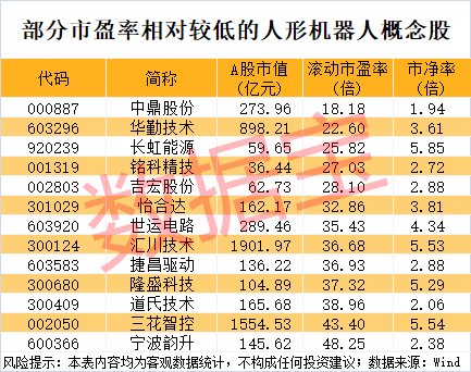 从估值水平方面来看,数据宝统计,截至12月3日收盘,上述36只人形机器人概念股中,滚动市盈率低于30倍的有5只,分别为、、、、。