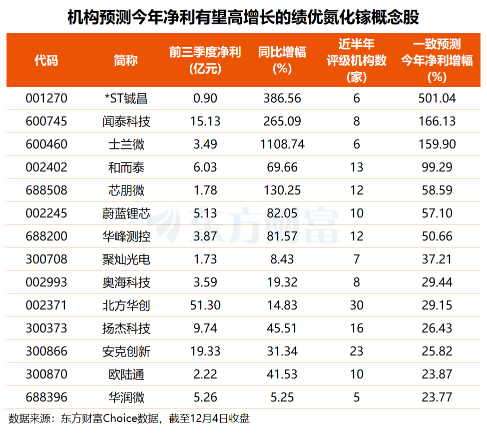 业绩方面,共有33只氮化镓概念股前三季度净利润实现正增长(含扭亏为盈),占比近七成。其中,赛微电子同比增幅居首,达1438.05%,净利增幅也高达11倍,、等5股净利均实现翻倍增长。