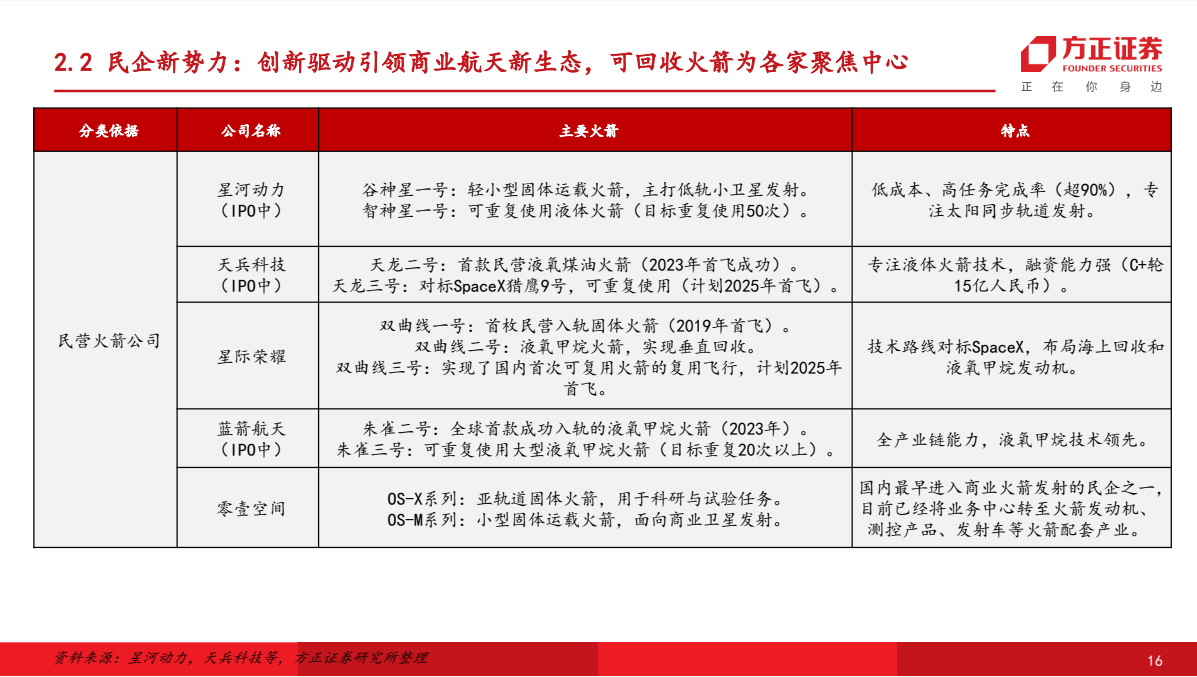 从上游航天器及其配套制造来看,聚焦液体火箭的蓝箭航天、星际荣耀、深蓝航天等,以及聚焦固体火箭的星河动力、中科宇航、东方空间等,共同组成运载火箭研发制造的民营力量,天兵科技、九州云箭等则持续专注运载火箭发动机的设计。