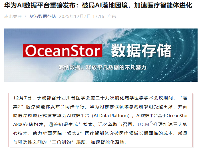 “华为数据存储”发布消息,12月7日,华为面向医疗领域正式发布华为AI数据平台(AI Data Platform)。AI数据平台基于OceanStor A800存储构建,涵盖知识生成与检索、记忆萃取与召回、UCM推理加速三大核心技术,助力华西医院“睿宾2”医疗智能体突破医疗领域长期面临的成本、质量与可及性之间的“三角制约”瓶颈,加速智能化落地。