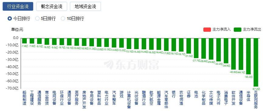 净流出方面,、、等净流出排名靠前,其中互联网服务净流出67.17亿元。