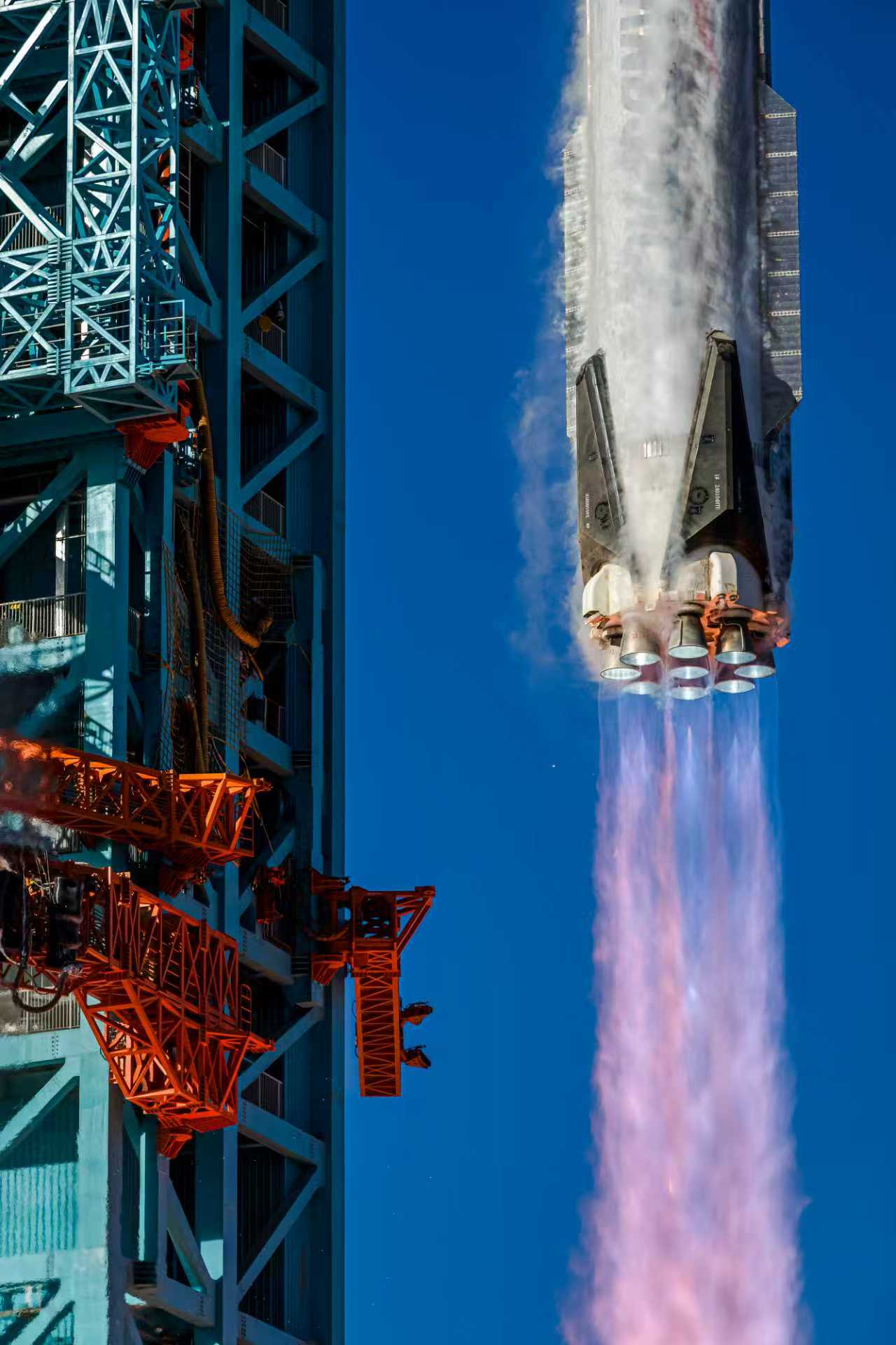 经过一个多月的等待,“隆隆”声终于从发射架那端传来。火焰从九个发动机底部喷射而出,伴随着滚滚白烟,将这个高约66米、直径约4.5米、穿着“不锈钢铠甲”的火箭,快速推向了空中。