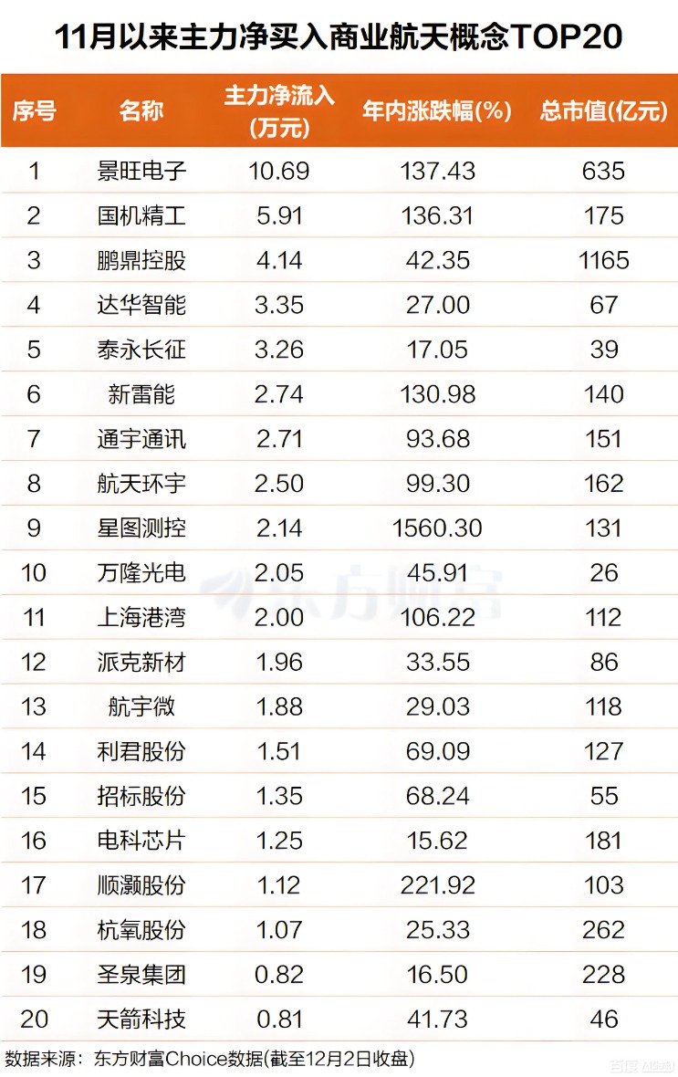 Choice数据显示,自今年11月以来,主力资金抢筹一批商业航天概念股,排名第一,主力净买入超10亿元;排名第二,主力净买入超近6亿元。