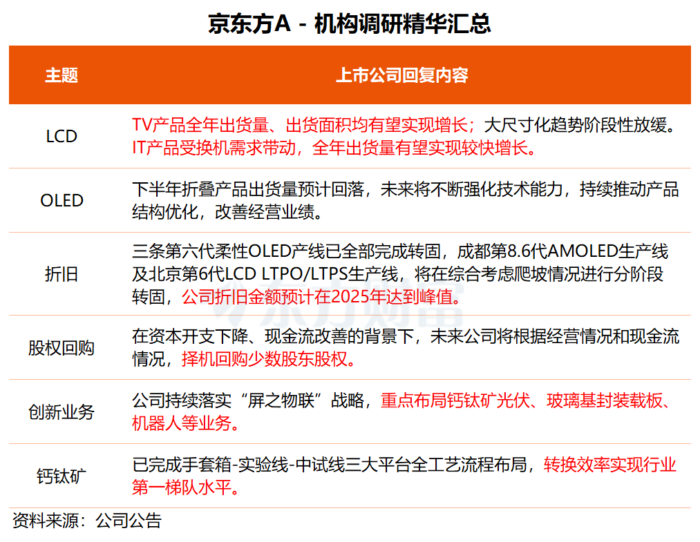 关于折旧趋势,京东方A透露,公司折旧金额预计在2025年达到峰值,将持续优化产品产线定位,进一步提升运营效率,持续改善盈利水平。此外,在公司资本开支下降、现金流改善的背景下,未来公司将根据经营情况和现金流情况,择机回购少数股东股权。