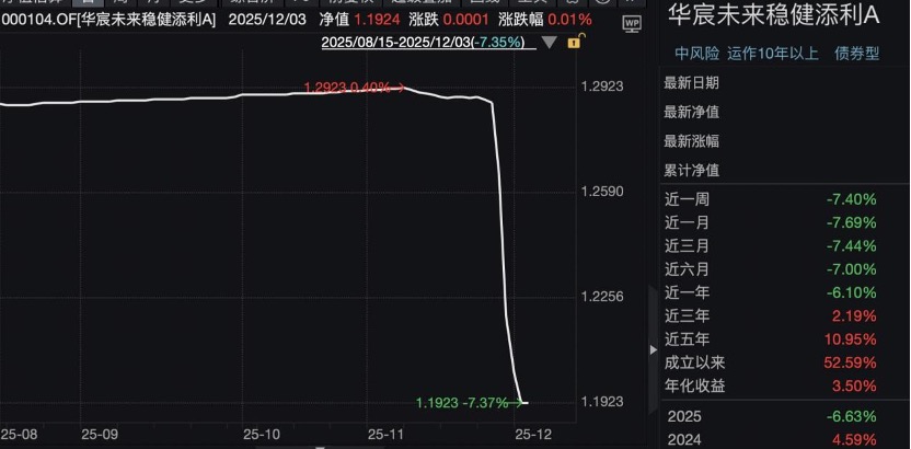 华宸未来稳健添利净值的断崖式回撤引发市场的关注,该基金11月27日至12月1日三个交易日分别下跌1.77%、3.56%、1.48%,截至12月3日,近一周跌幅达到7.4%。