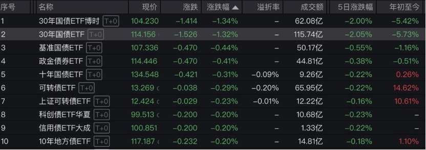 基准国债ETF、政金债ETF、十年国债ETF、可转债ETF单日跌幅居前。53只债券ETF中,仅有东财国债ETF、海富通短融ETF单日收涨。