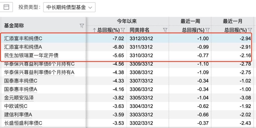 场外基金中,似乎更为惨烈。汇添富丰和纯债C年内跌幅超7%,垫底同类排名。此外,民生加银瑞夏一年定开债、华泰保兴尊益利率债6个月持有等跌幅居前,分别达到5.65%、4.56%。