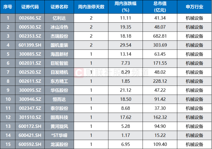 若以股价活跃度统计,本周共有15只机械设备股录得涨停行情,其中,亿利达、、冰山冷热、杰瑞股份4股获2次涨停,、、固高科技、、、等板块大、中市值股也在列。从周内表现上看,国机重装、、冰山冷热、恒而达、杰瑞股份、固高科技、、亿利达等股本周涨幅居前。