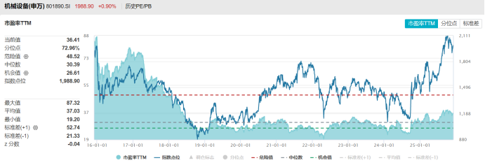 从估值层面来看,截至今日数据,机械设备板块指数(申万一级)目前市盈率36.41倍,处于近十年72.96%分位点;市净率2.94倍,处于近十年82.76%分位点。若以整个市场统计,机械设备板块指数目前市盈率分位点在31个申万一级板块中位列第12位,市净率分位点则位列第4位,仅低于通信、电子、汽车板块。