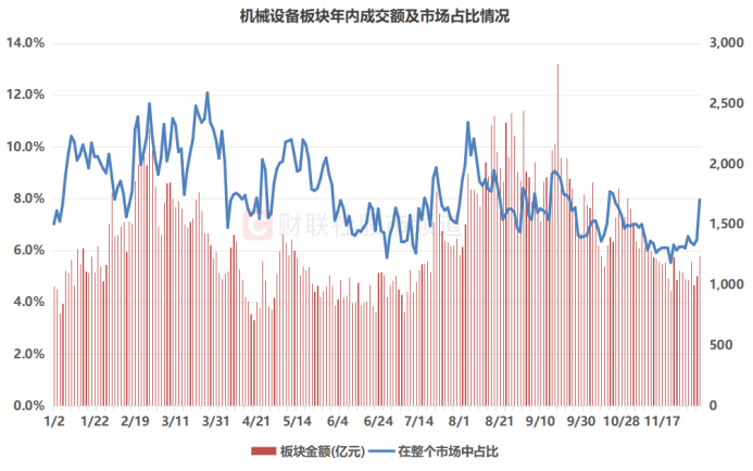 受、航天等概念提振,机械设备板块近期成为市场关注焦点。以量能数据统计,其今日成交总额1241.84亿元,创11月11日以来近3周新高,同时,其在整个A股市场中占比7.95%,为10月23日以来近5周新高。从全年行情上看,机械设备板块曾多次高度活跃,其在9月18日录得年内最高成交额纪录,并于3月26日获年内最高成交额占比数据。