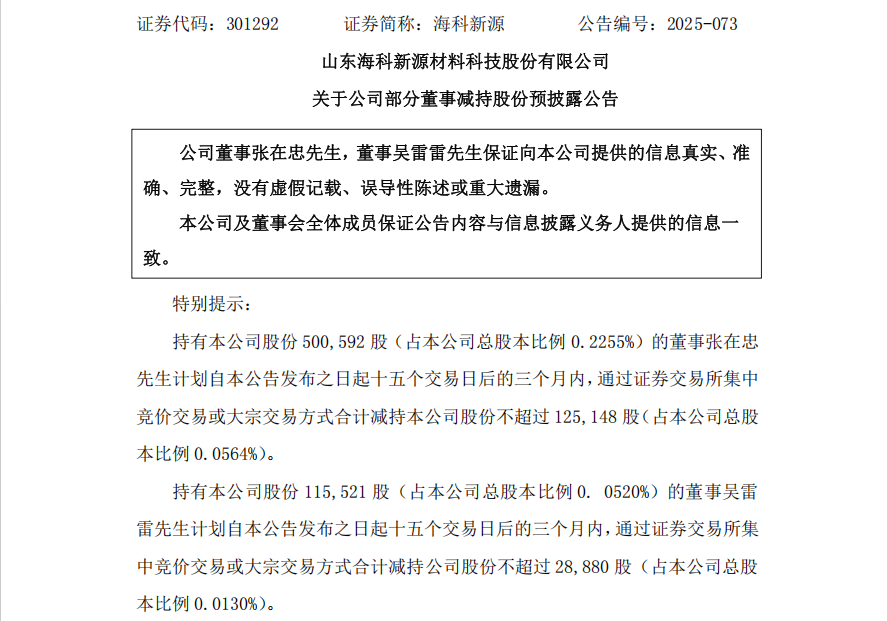 同时,海科新源董事张在忠、吴雷雷以自身资金需求为由,拟分别减持海科新源不超过0.0564%、0.0130%的股份。