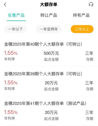 其中,3年期大额存单产品为“2025年第四期3年期个人大额存单”“2025年第三期3年期个人大额存单”,分别以100万元起存、20万元起存,利率均为1.55%,但以100万元起存产品目前已显示售罄。