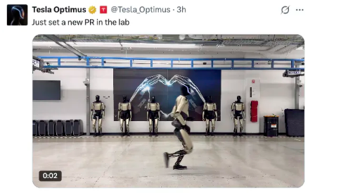 12月3日,马斯克在社交平台X转发特斯拉擎天柱(Optimus)团队发布一段“擎天柱”人形机器人跑步的短视频。该团队配文称:刚在实验室刷新了个人纪录(PR,Personal Record),该话题还一度冲上国内热搜第一。